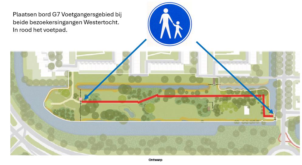 dit opgelost kan worden door het groengebied de Westertocht formeel te bestemmen tot voetgangersgebied, middels de daarbij passende RVV bebording waarop handhaving mogelijk is;