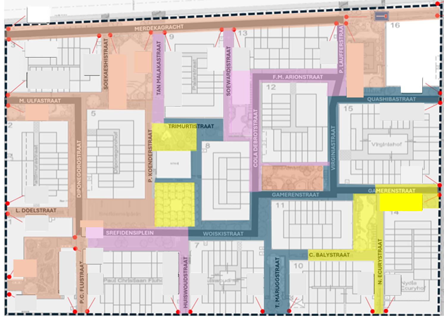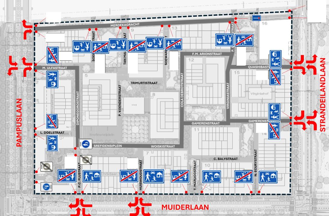 De besluiten onder 1 en 2 gefaseerd uit te voeren in vier fasen, zoals afgebeeld op de onderste tekening :1e fase (geel) de inrichting is gereed bij publicatie van dit besluit, 2e fase (blauw): definitieve inrichting Q3 2025 t/m Q2 2026, 3e fase (paars): definitieve inrichting Q1 2027 t/m Q2 2027, 4e fase (bruin): definitieve inrichting Q1 2028 t/m Q2 2028