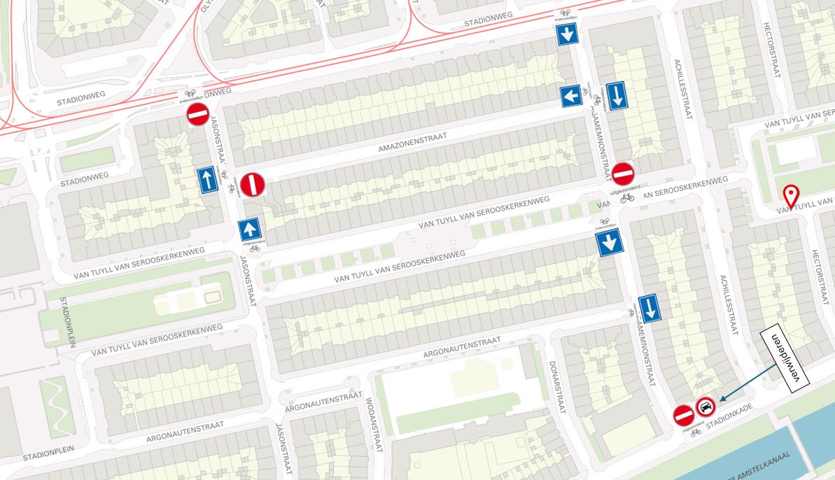 Door het plaatsen van verkeersborden conform model C2, C3 en C4 van Bijlage I van het RVV 1990, met onderborden uitgezonderd fiets aan te wijzen: een eenrichtingsweg, in deze richting gesloten voor voertuigen, ruiters en geleiders van rij- of trekdieren of vee, uitgezonderd fietsers, in de Agamemnonstraat, de Amazonenstraat en de Jasonstraat, het deel tussen de Stadionweg en de van Tuyll van Serooskerkenweg.