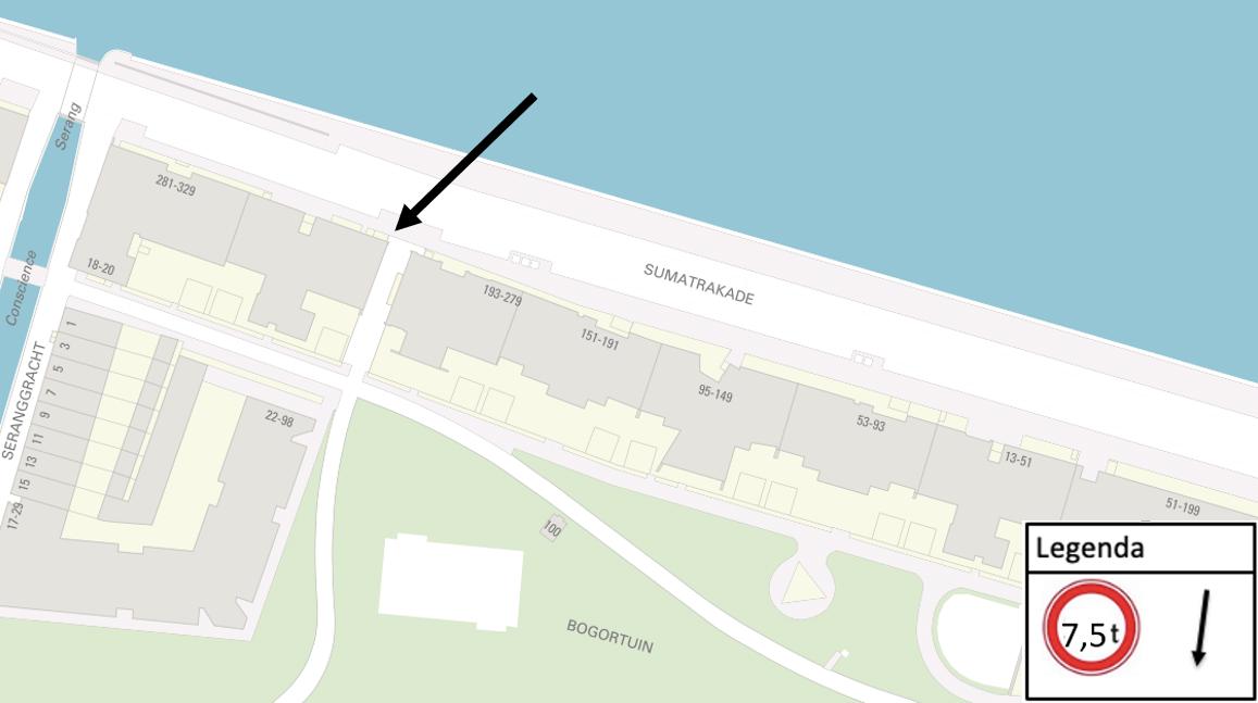 Door het plaatsen van verkeersbord conform model C21 van Bijlage I van het RVV 1990, aan te wijzen: een geslotenverklaring voor voertuigen en samenstellen van voertuigen, waarvan de totaalmassa hoger is dat 7,5 ton, op de onderdoorgang bij de Sumatrakade, ter hoogte van perceel 193-279.
