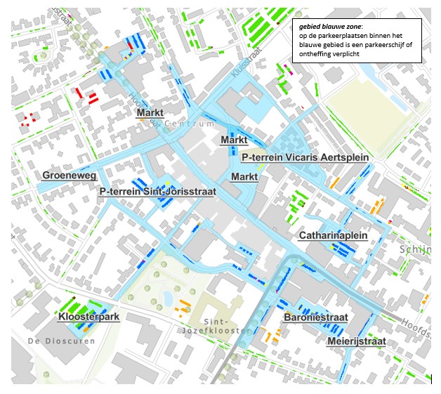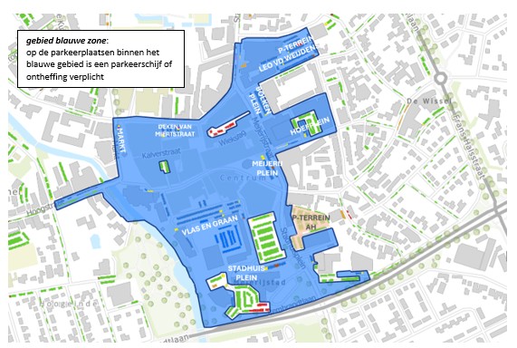Om te zorgen dat de parkeerplaatsen in het centrum door bezoekers gebruikt kunnen worden zijn circa 265 parkeerplaatsen gereguleerd met een blauwe zone. Op de parkeerplaatsen binnen de blauwe zone mag maximaal 2 uur geparkeerd worden. In basis geldt de blauwe zone van maandag tot en met zaterdag van 08.00 tot 18:00 uur.
