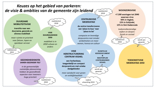 In dit hoofdstuk beschrijven we de bepalende visies, ambities en ruimtelijke ontwikkelingen die invloed hebben op de invulling van parkeren in de dorpscentra. Parkeren is namelijk geen doel op zich, maar een middel om de visie en ambities van de gemeente te ondersteunen. De visies en ambities van de gemeente Meierijstad hebben allemaal directe of indirect invloed op parkeren. De implicaties voor het te voeren parkeerbeleid kunnen per centrum verschillen. In dit hoofdstuk worden de implicaties voor parkeren op hoofdlijnen geschetst.