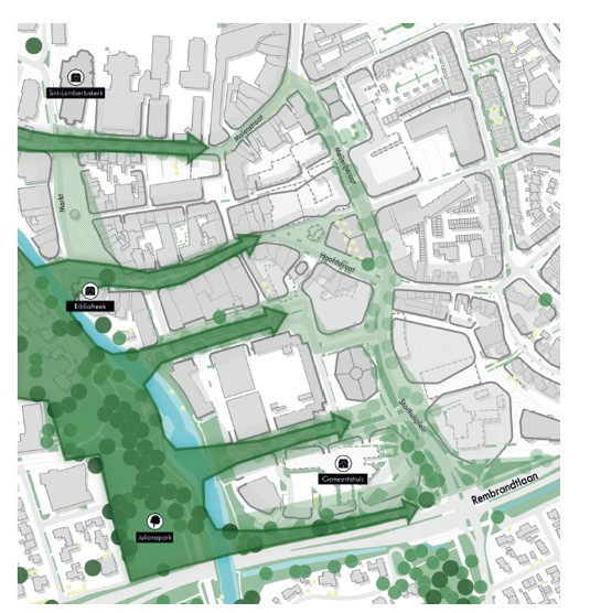 Een belangrijk thema voor het creëren van een prettig, toekomstbestendig centrum is het aansterken van het groen. Door een aantal groene wiggen te creëren vanuit het Julianapark wordt de hittestress aangepakt, maar ook een wandeling door het centrum gecre¬ëerd door een aaneensluiting van pret¬tige openbare ruimtes.