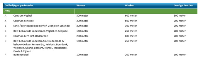 De auto- en fietsparkeerplaatsen die worden ingezet voor een bouwontwikkeling moeten op een acceptabele loopafstand liggen. Voor fietsparkeerplaatsen gelden voor héél Meierijstad dezelfde maximale loopafstanden. In gemeente Meierijstad gelden de maximale loopafstanden zoals opgenomen in onderstaande tabel: