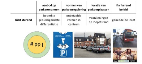 We maken hierbij een onderscheid in de volgende niveaus van parkeerbeleid: geen beperkingen (1), licht sturend (2), sturend (3) en zeer strikt (4). De knoppen waaraan gedraaid kan worden, hebben we samengevat in: