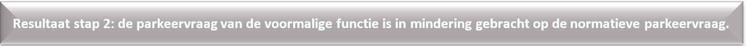 Uit dit rekenvoorbeeld volgt de werkdagnacht als maatgevend moment met een parkeereis van 25 autoparkeerplaatsen. Vanuit de bestaande situatie kunnen 23 autoparkeerplaatsen aangesproken worden (salderen). De resterende 2 parkeerplaatsen (25 – 23) gelden als de nog te realiseren (door ontwikkelaar) parkeereis.