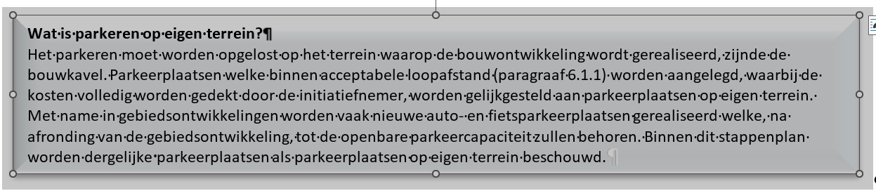 Terrein waarop de bouwontwikkeling wordt gerealiseerd, alsmede een aansluitend of ergens anders gelegen terrein waarover de initiatiefnemer privaatrechtelijke zeggenschappen heeft en waarbij wordt voldaan aan de maximaal acceptabele loopafstanden zoals beschreven in bijlage 6. |