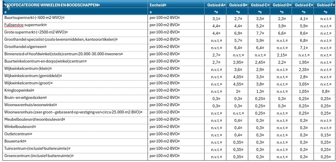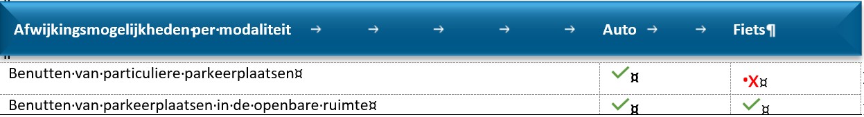 In de volgende tabel is de parkeereis per moment van de week weergegeven: