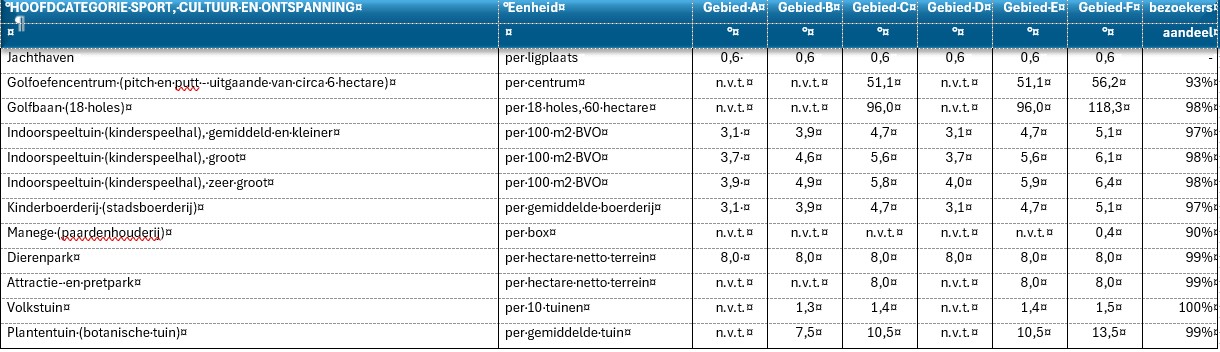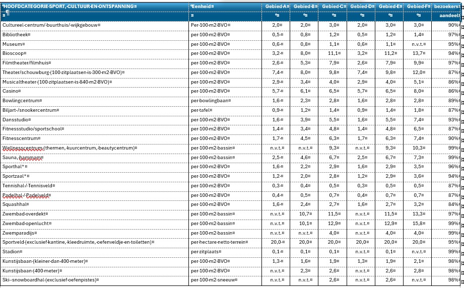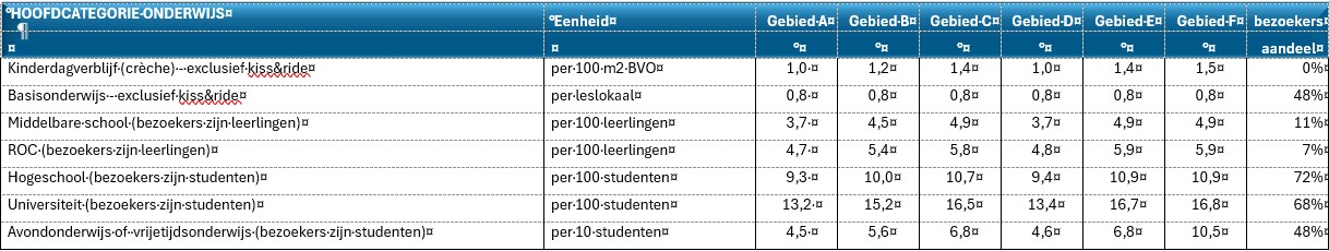 Met onderstaande aanwezigheidspercentages kan worden bepaald welk aandeel van de auto- en fietsparkeerplaatsen op verschillende momenten door verschil-lende gebruikersgroepen kunnen worden (dubbel) gebruikt. Deze aanwezigheidspercentages zijn afgeleid uit landelijke kencijfers van het CROW (publicatie 741).