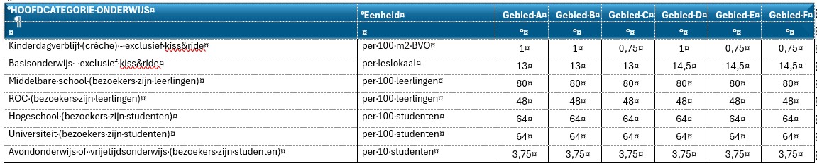 In het Bouwbesluit staan de minimale eisen waaraan voldaan moet worden bij nieuwbouw of verbouwingen. Wanneer voor een gelijkwaardig (collectief) alternatief wordt gekozen, wordt het aantal aan te leggen fietsparkeerplaatsen op eigen terrein vastgesteld aan de hand van onderstaande tabellen. Deze parkeernormen zijn gebaseerd op de landelijke CROW-parkeerkencijfers bandbreedte voor de fiets (2024), variërend tussen laag, gemiddeld en hoog. Meierijstad kiest ervoor om het gemiddelde van de landelijke CROW-fietsparkeerkencijfers te verkiezen. Met deze fietsparkeernormen wordt het benodigde aantal fietsparkeerplaatsen bepaald waar bouwontwikkelingen in Meierijstad in moeten voorzien.