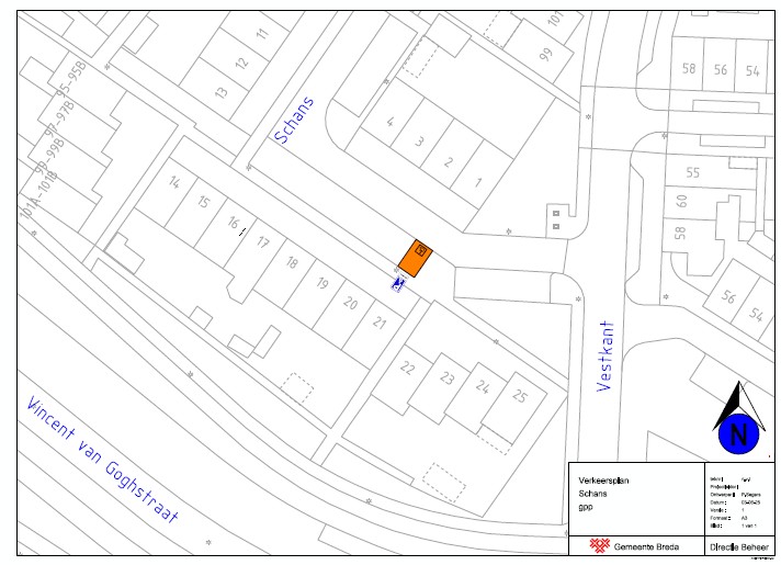 Een gehandicaptenparkeerplaats op kenteken aan te wijzen in de Schans ter hoogte van huisnummer 21 te Breda. Een en ander zoals weergegeven op de bijgevoegde tekening ‘Verkeersplan Schans gpp’.