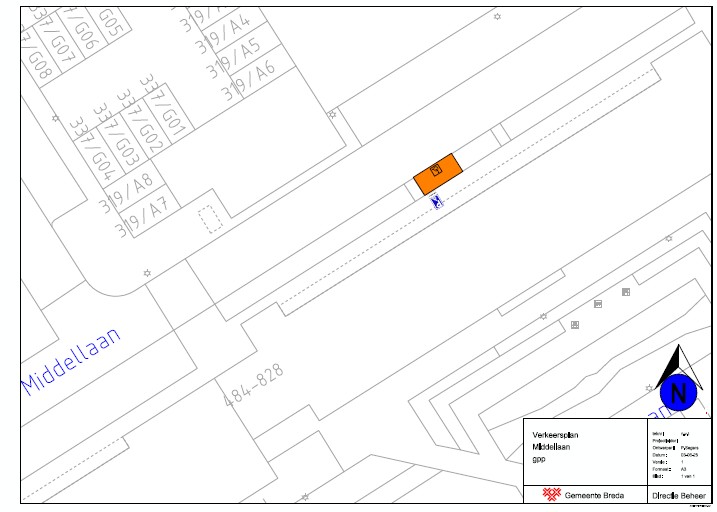 Een gehandicaptenparkeerplaats op kenteken aan te wijzen in de Middellaan ter hoogte van het appartementengebouw met huisnummers 484 t/m 828 te Breda. Een en ander zoals weergegeven op de bijgevoegde tekening ‘Verkeersplan Middellaan gpp’.
