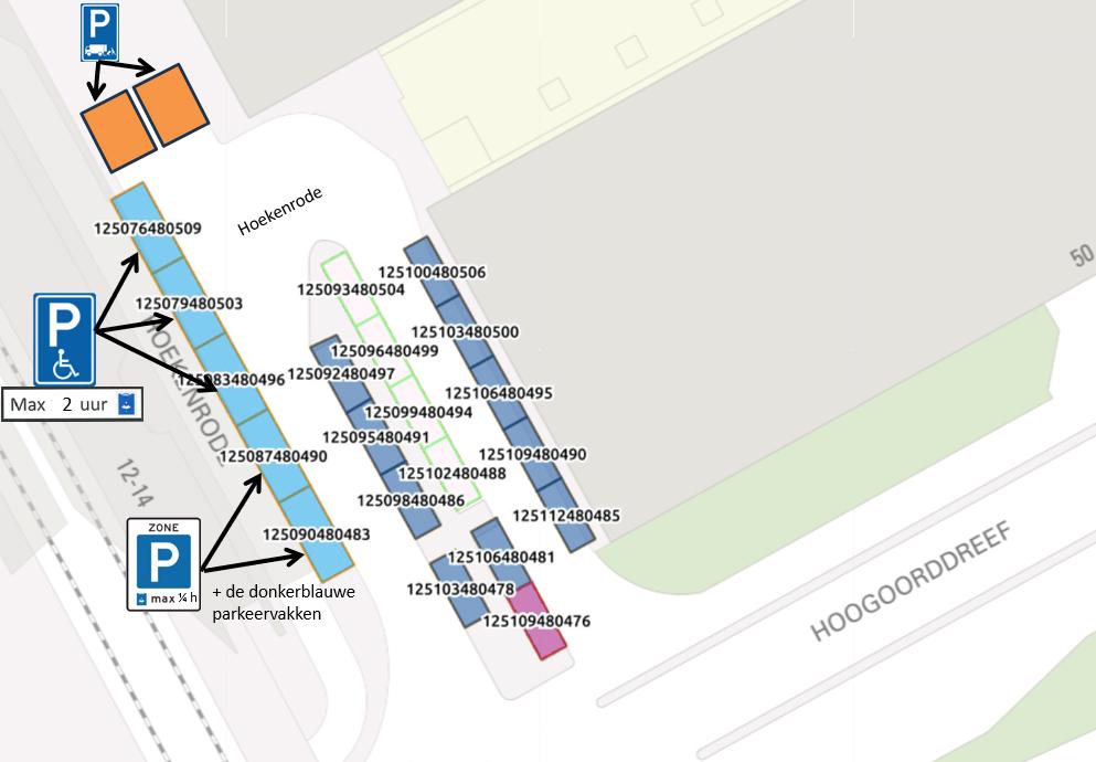 om de bereikbaarheid van station Bijlmer Arena en de nabij gelegen winkels te waarborgen in 2020 een verkeersbesluit met kenmerknummer 18970 gepubliceerd is in het gemeenteblad waarbij er o.a. een parkeerschijfzone waarin maximaal 30 minuten geparkeerd mag en er algemene gehandicaptenparkeerplaatsen zijn ingesteld op de parkeervakken direct ten oosten van perceel Hoekenrode 12-14;