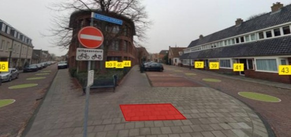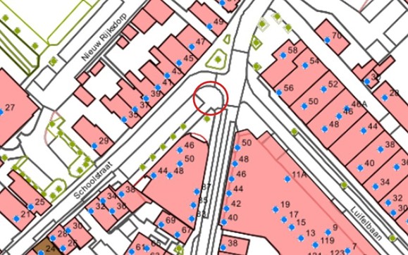 Zie rode cirkel op de plattegrond en rood vlak op de situatiefoto. Plaatsing ondergrondse restafvalcontainer in bestaand trottoir.
