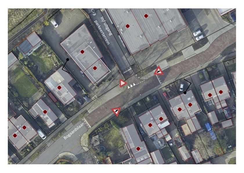 Om de voorrangssituatie te verduidelijken en de verkeersveiligheid te verbeteren, wordt besloten een voorrangsregeling in te stellen. Hierbij moet verkeer dat vanaf het parkeerterrein komt, voorrang verlenen aan verkeer op de Bogaardslaan.