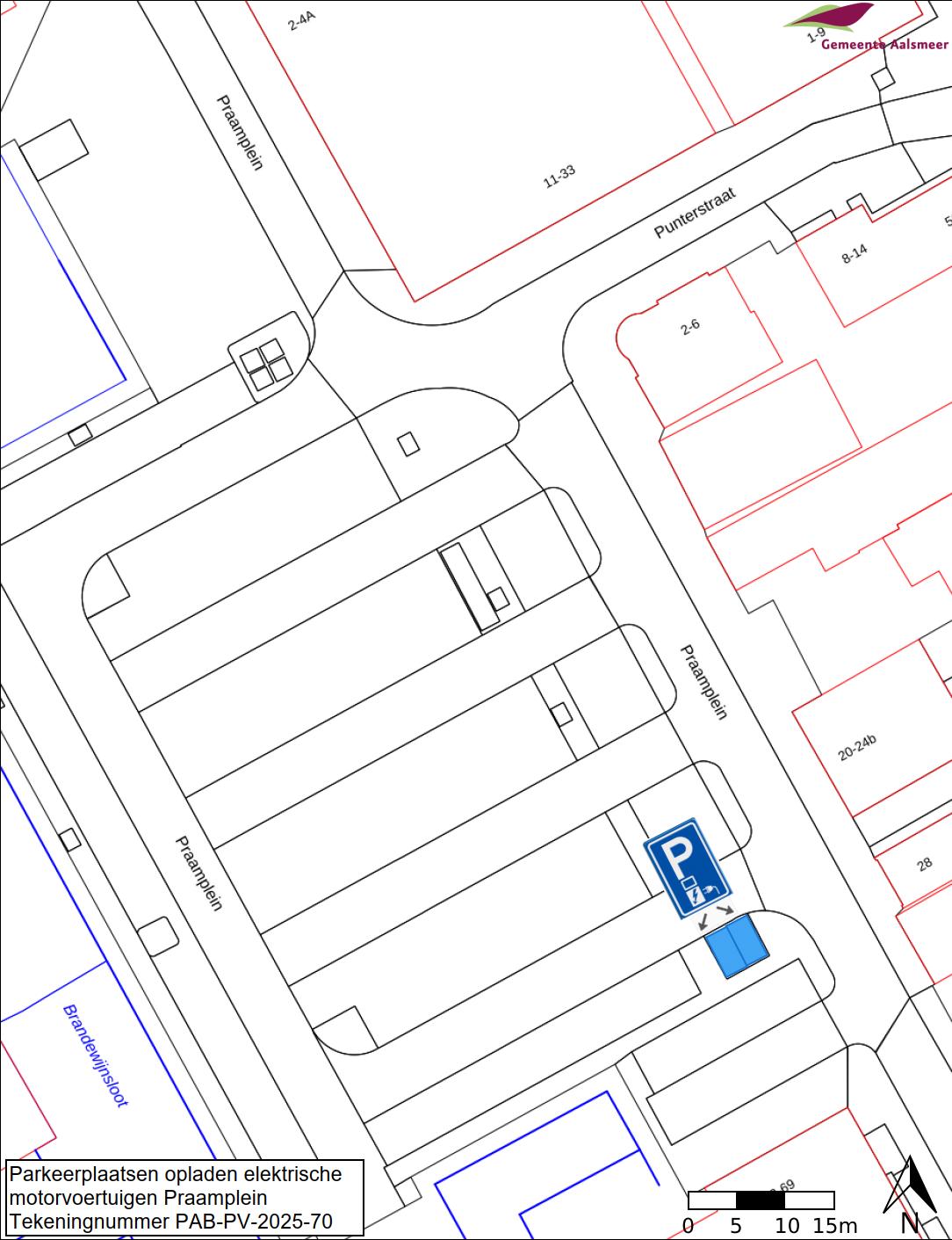 Burgemeester en wethouders van Aalsmeer besluiten om op het parkeerterrein bij Praamplein twee parkeerplaatsen aan te wijzen als parkeerplaats voor het opladen van elektrische motorvoertuigen. De parkeerplaatsen mogen alleen gebruikt worden voor het opladen van deze elektrische motorvoertuigen.