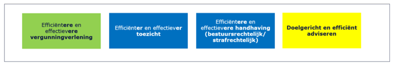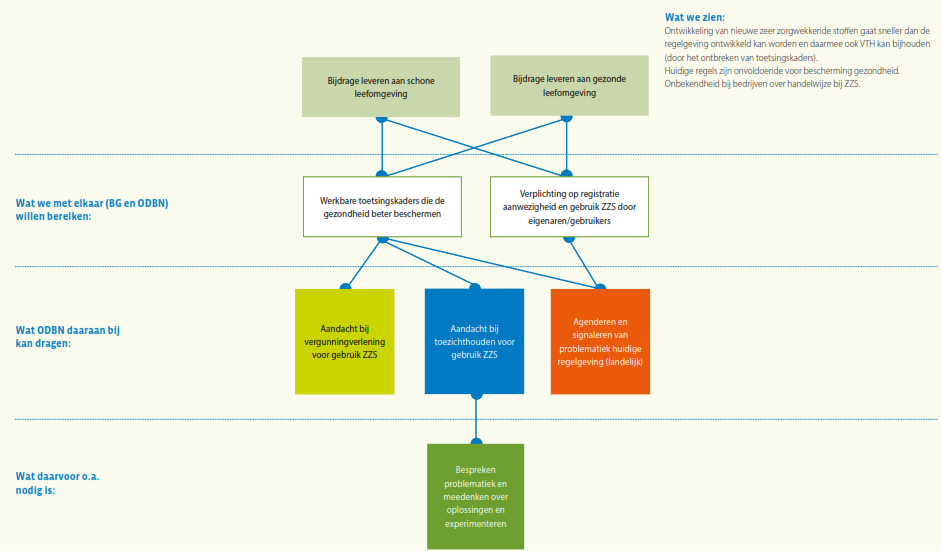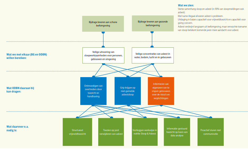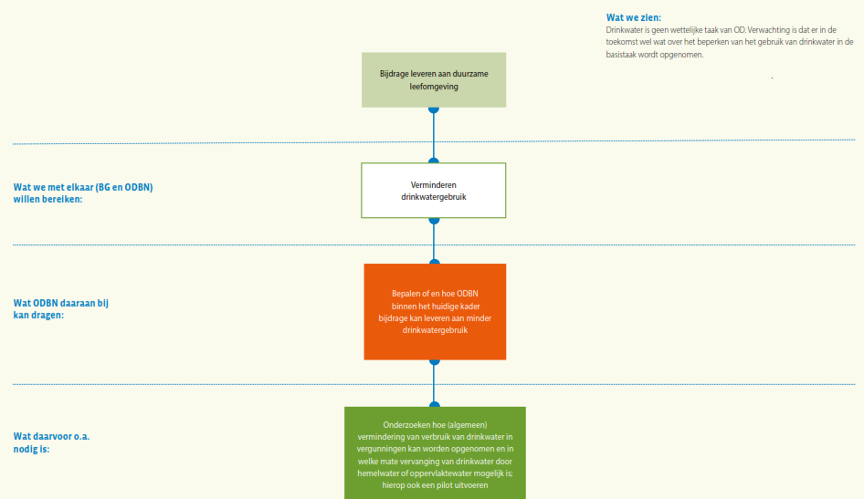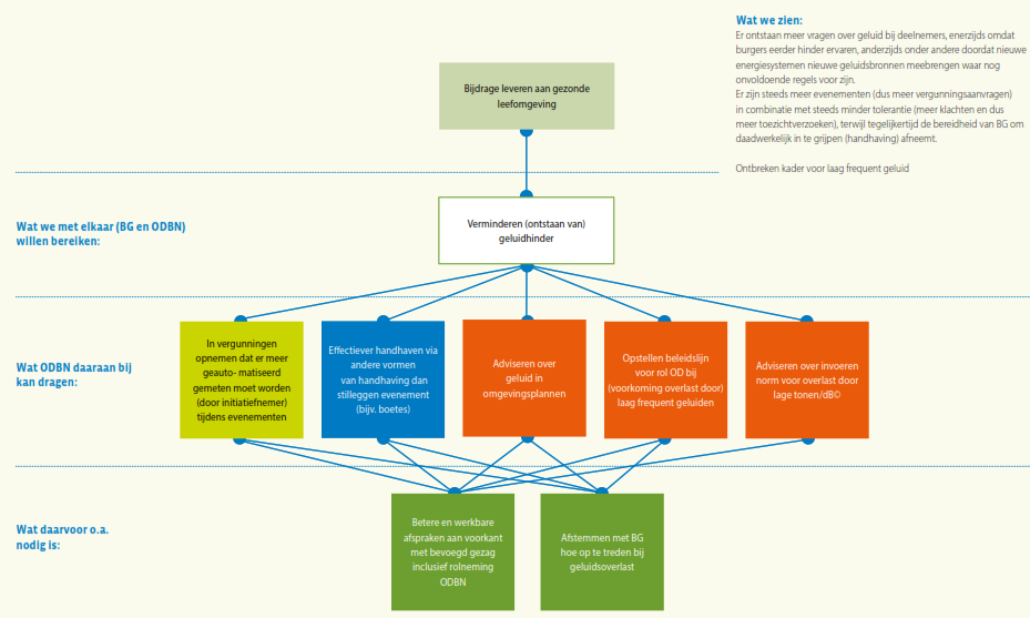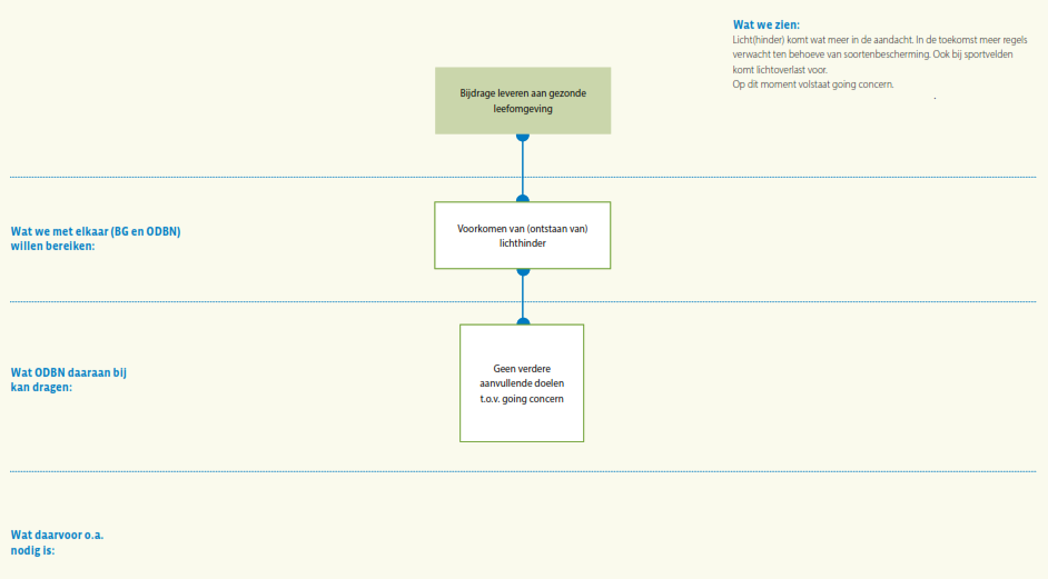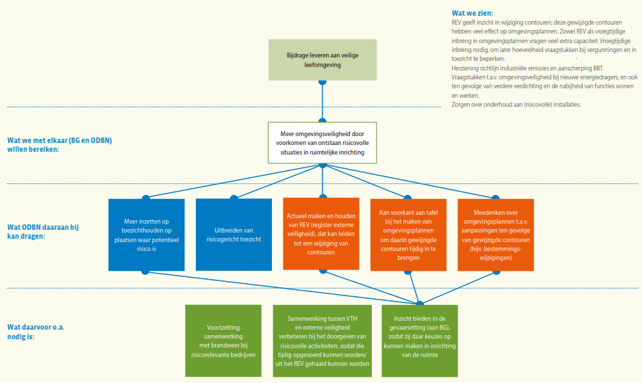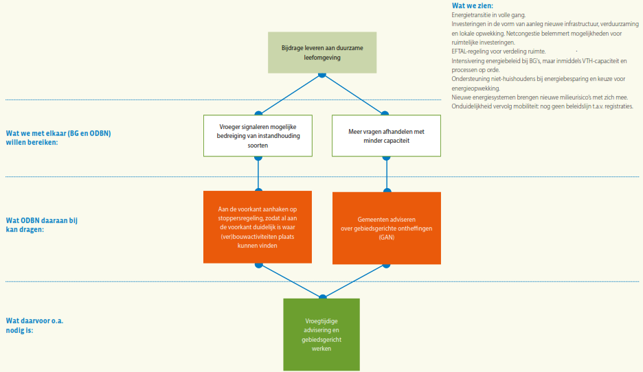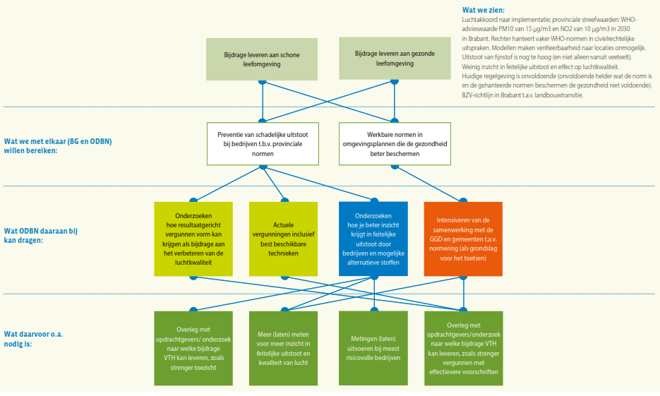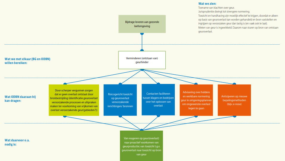Daaronder staat wat de bevoegde gezagen samen met ODBN op dit expertisegebied met de VTH-taakuitvoering willen (helpen) bereiken. Het is evident dat ODBN slechts een bijdrage kan leveren aan het bereiken van deze doelstellingen, omdat bijvoorbeeld in het formuleren van beleid en het tot stand komen van wet- en regelgeving niet ODBN, maar de deelnemers zelf aan zet zijn. Bovendien ligt er wel een wettelijke verplichting om basistaken door een omgevingsdienst te laten uitvoeren, maar staat het de deelnemers vrij of zij ook verzoektaken bij ODBN onderbrengen, of die zelf ter hand nemen. In de regel ‘Wat ODBN daaraan bij kan dragen’ staat daarom wat ODBN specifiek kan doen om de veranderingen in de context bij het realiseren van deze gezamenlijke doelstelling het hoofd te bieden. Hier staat dus hoe ODBN zijn specifieke eigen bijdrage ziet: wat stelt ODBN zich ten doel op dit gebied voor de komende vier jaar? Deze bijdrage van ODBN zal zich afspelen binnen de verschillende taakgebieden van ODBN: de vergunningverlening, handhaving en toezicht, en ondersteunende advisering. Voor elk van deze taakgebieden geldt dat ODBN zijn werk als professionele organisatie in nauwe afstemming op de ontwikkelingen om zich heen en steeds beter wil gaan doen. Voor de herkenbaarheid is voor elk expertisegebied per subdoel aangegeven bij welk taakgebied dit doel hoort: groen voor vergunningverlening, blauw voor toezicht en handhaving en geel voor advisering.