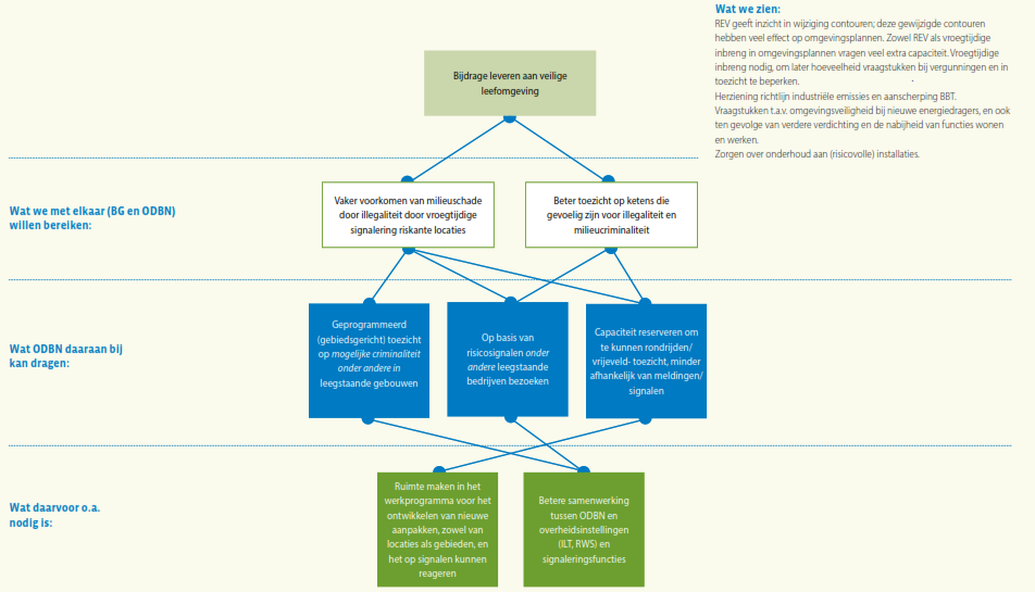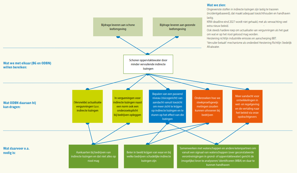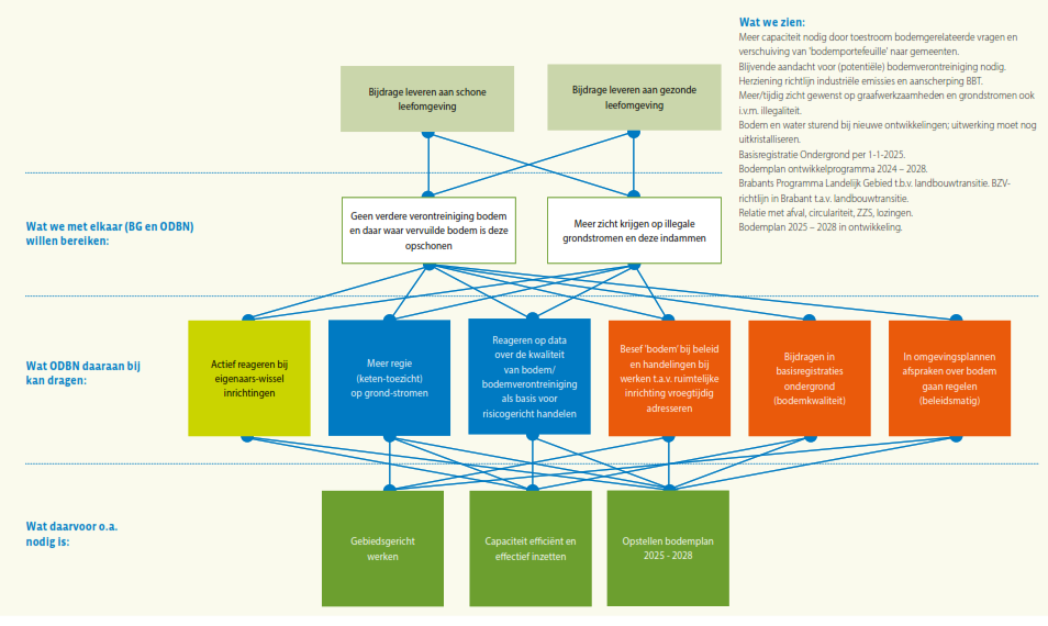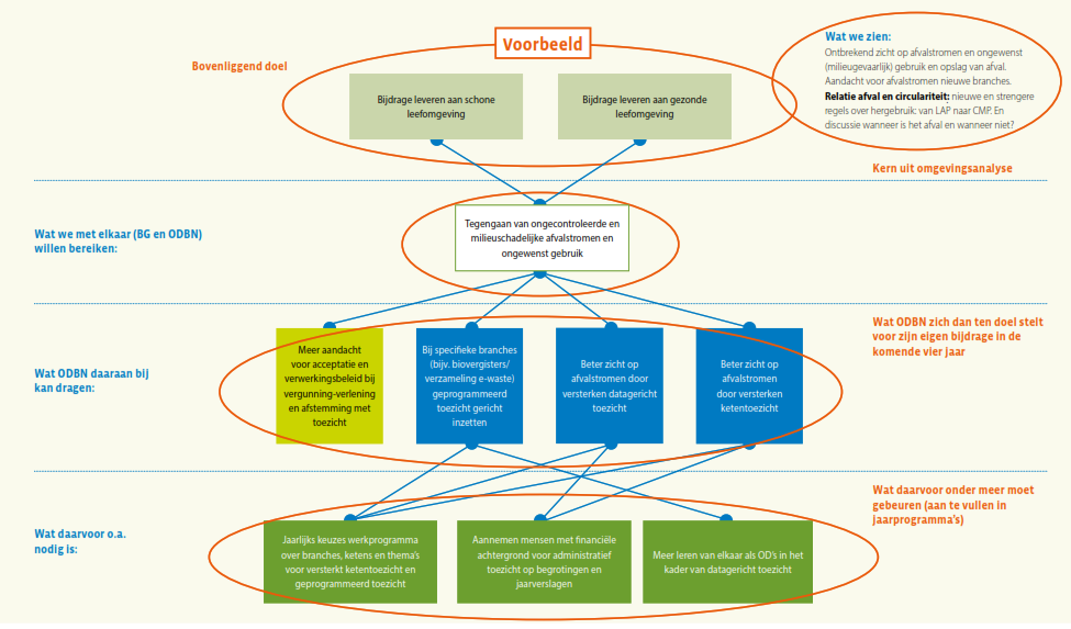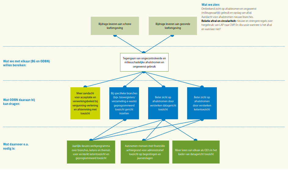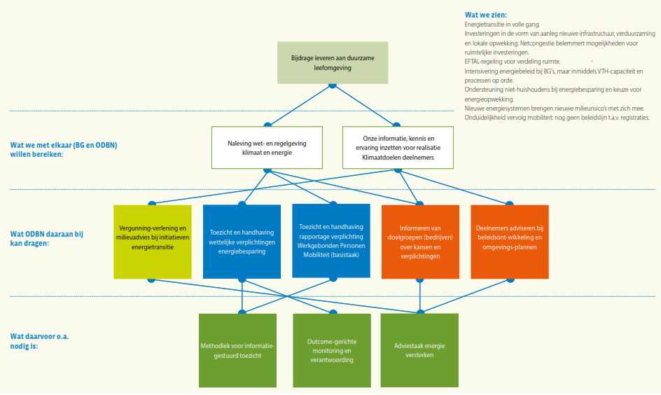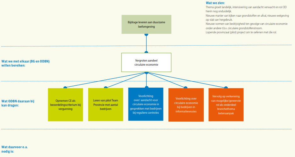 ODBN wil het risico- en resultaatgericht werken waarop zij al eerder heeft ingezet, verder uitbouwen, door bij het toezicht de kans dat er een schadelijk milieu-effect optreedt en de ernst van dat effect mee te wegen in hoe vaak en waar er toezicht gehouden wordt. Als het gaat om het vergunningenproces wil men waar mogelijk vergunningen zodanig opstellen dat er meer zekerheid is over het resultaat tijdens de looptijd van de vergunning, door bijvoorbeeld een verplichting tot monitoring op uitstoot of lozingen op te nemen in de vergunning. Meer gebiedsgericht werken betekent dat casussen niet ‘stand alone’ maar in relatie tot het gebied waarin de casus zich bevindt wordt beschouwd; van incidentele vragen naar gebiedsgerichte samenhang dus. Ook het versterken van de samenwerking in de keten is een element waar ODBN (nog) meer op wil inzetten, onder andere ten behoeve van de vroegsignalering in het kader van omgevingsveiligheid en voor indicatie van aankomende ruimtelijke activiteit. Naast de VTH-taken ziet ODBN ook op veel vlakken een grotere rol in het signaleren, agenderen en adviseren ten behoeve van de beleidsontwikkeling of ter borging van de samenhang en uitvoerbaarheid van beleid. Data gedreven werken en het verder optimaliseren van processen is eveneens een al ingezet traject, wat voor elk van de genoemde doelstellingen randvoorwaardelijk is.
