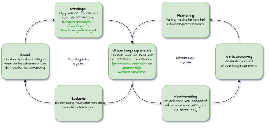 Bij het doorlopen van de regionale beleidscyclus worden wettelijke eisen en specifiek beleid vertaald naar de strategie voor de omgevingsdienst (de uitvoerings- en handhavingsstrategie, artikel 13.5 t/m 13.7 Omgevingsbesluit). Deze strategie dient vervolgens vertaald te worden naar een uitvoeringsprogramma (art. 13.8 Omgevingsbesluit), waarin de noodzakelijke activiteiten, capaciteit en middelen worden opgenomen voor een optimale inzet van het VTHA-instrumentarium om deze doelen te behalen.