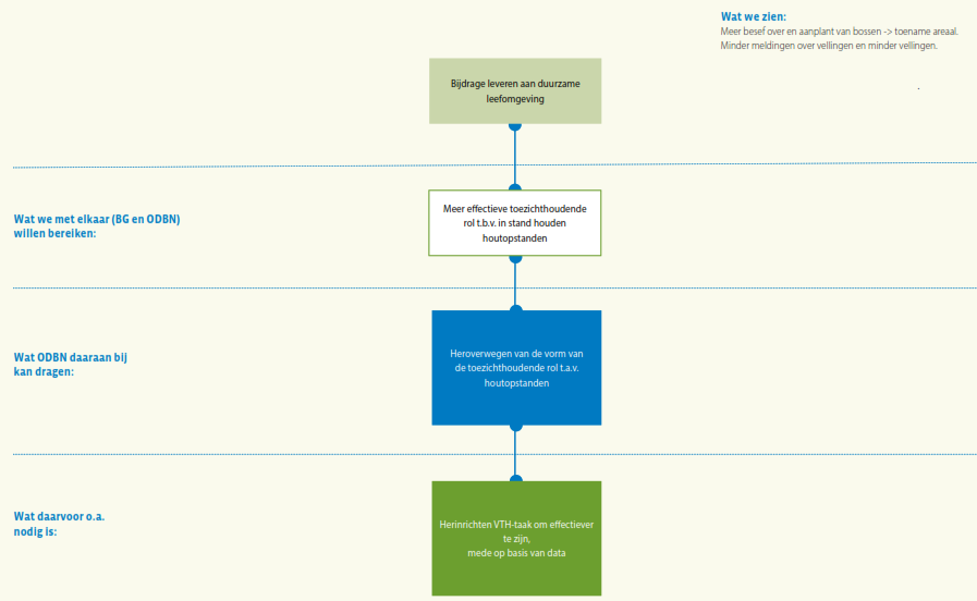De doelenbomen geven aan welke doelstellingen de bevoegde gezagen (BG) en ODBN willen bereiken met hun taakuitvoering op het vlak van VTH. Deels kunnen deze doelstellingen in de komende periode nog verder worden geconcretiseerd en – in vergelijking met beschikbare capaciteit, budgetten en overige beleidstaken bij de bevoegde gezagen – ook worden geprioriteerd. In alle gevallen worden de activiteiten die nodig zijn om de gestelde doelen te realiseren – daar waar ze betrekking hebben op het taakgebied van ODBN – uitgewerkt in de jaarlijkse werkprogramma’s. De voortgang van de uitvoering van deze werkprogramma’s dient onderdeel te zijn van (gezamenlijke) monitoring en de daaruit vloeiende mate van doelbereiking, onderdeel van periodieke evaluatie. Een en ander is conform de UHS.