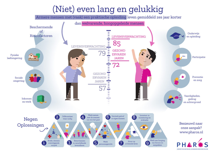 De gezondheidsverschillen tussen mensen worden steeds groter. Zoals in figuur 5 te zien leven mensen met een laag inkomen en praktische opleiding gemiddeld zes jaar korter dan welvarende hoogopgeleide mensen. Ook kampen ze vijftien jaar langer met een minder goede gezondheid. We willen dat iedereen dezelfde kansen krijgt op een gezond leven.