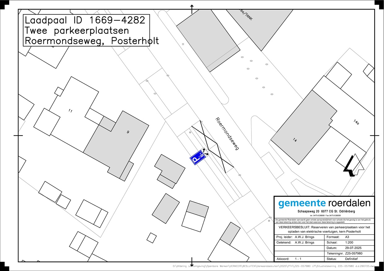 Een 4-tal parkeerplaatsen worden aangewezen en gereserveerd voor het opladen van elektrische voertuigen op de onderstaande genoemde locaties binnen de kern Posterholt in de gemeente Roerdalen. Een en ander wordt gerealiseerd door het plaatsen van het verkeersbord E8c (RVV 1990) ondersteund met het onderbord OB504 en aangevuld met ondersteunende markering(en).