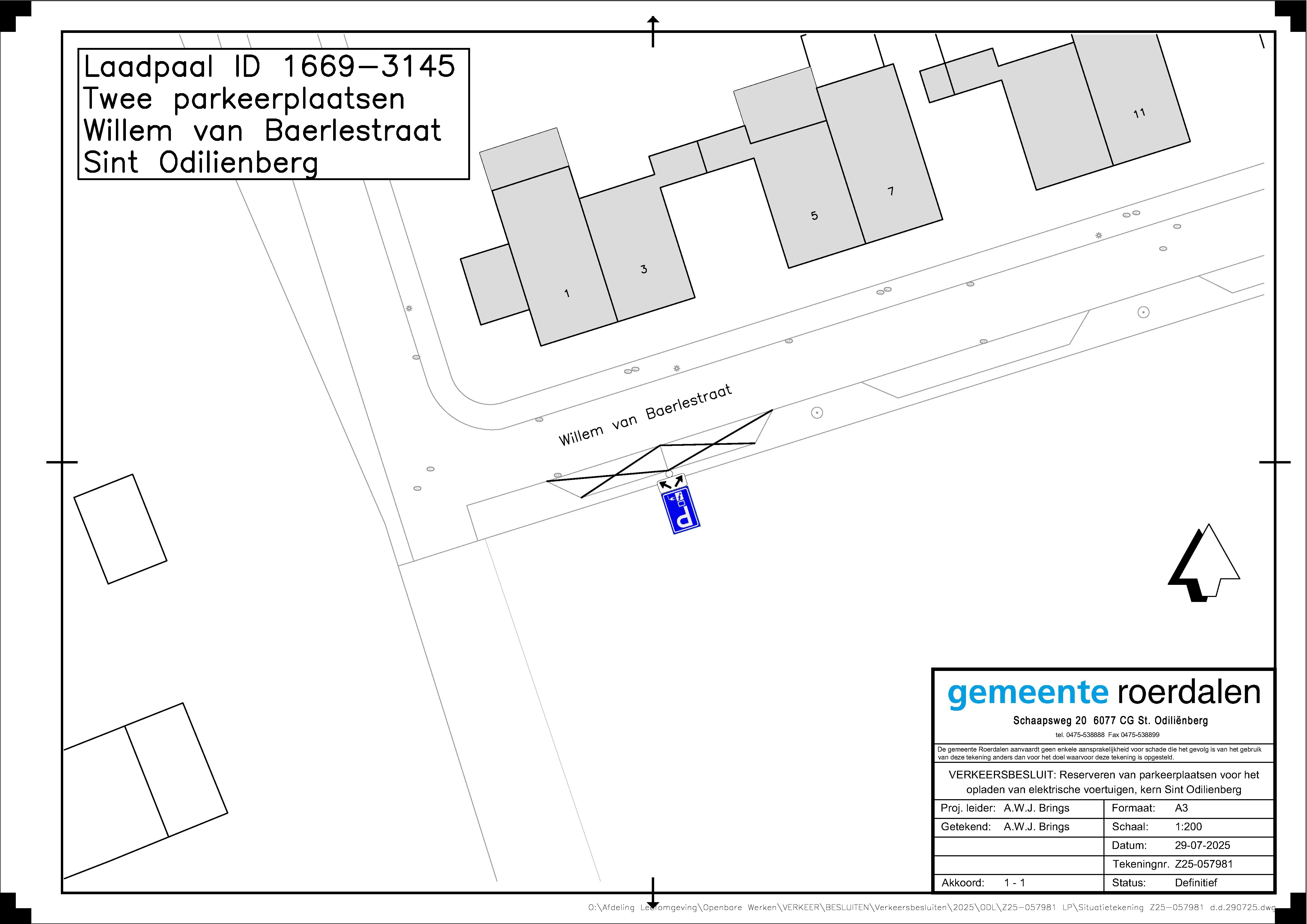 Een 4-tal parkeerplaatsen worden aangewezen en gereserveerd voor het opladen van elektrische voertuigen op de onderstaande genoemde locaties binnen de kern Sint Odiliënberg in de gemeente Roerdalen. Een en ander wordt gerealiseerd door het plaatsen van het verkeersbord E8c (RVV 1990) ondersteund met het onderbord OB504 en aangevuld met ondersteunende markering(en).
