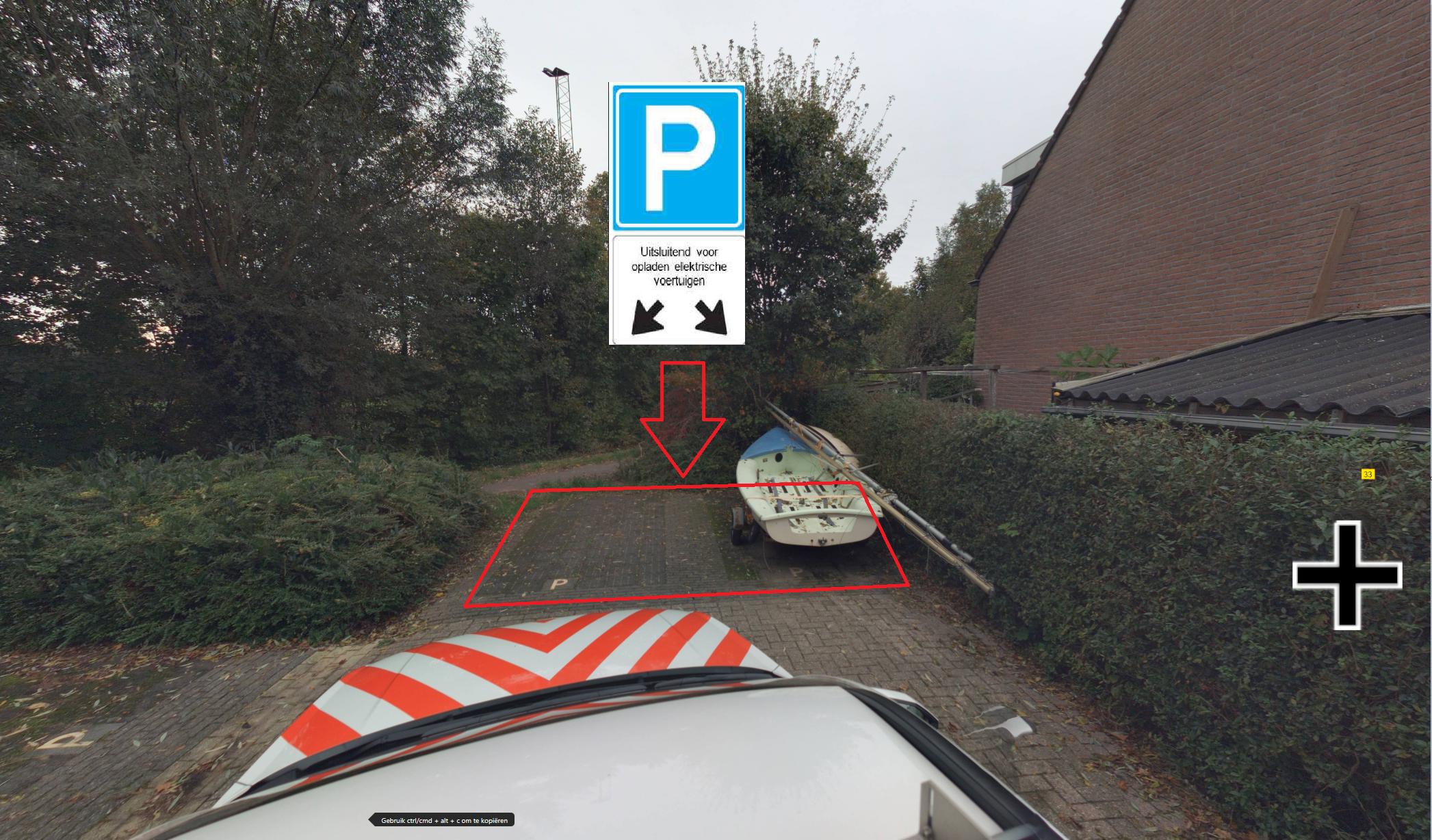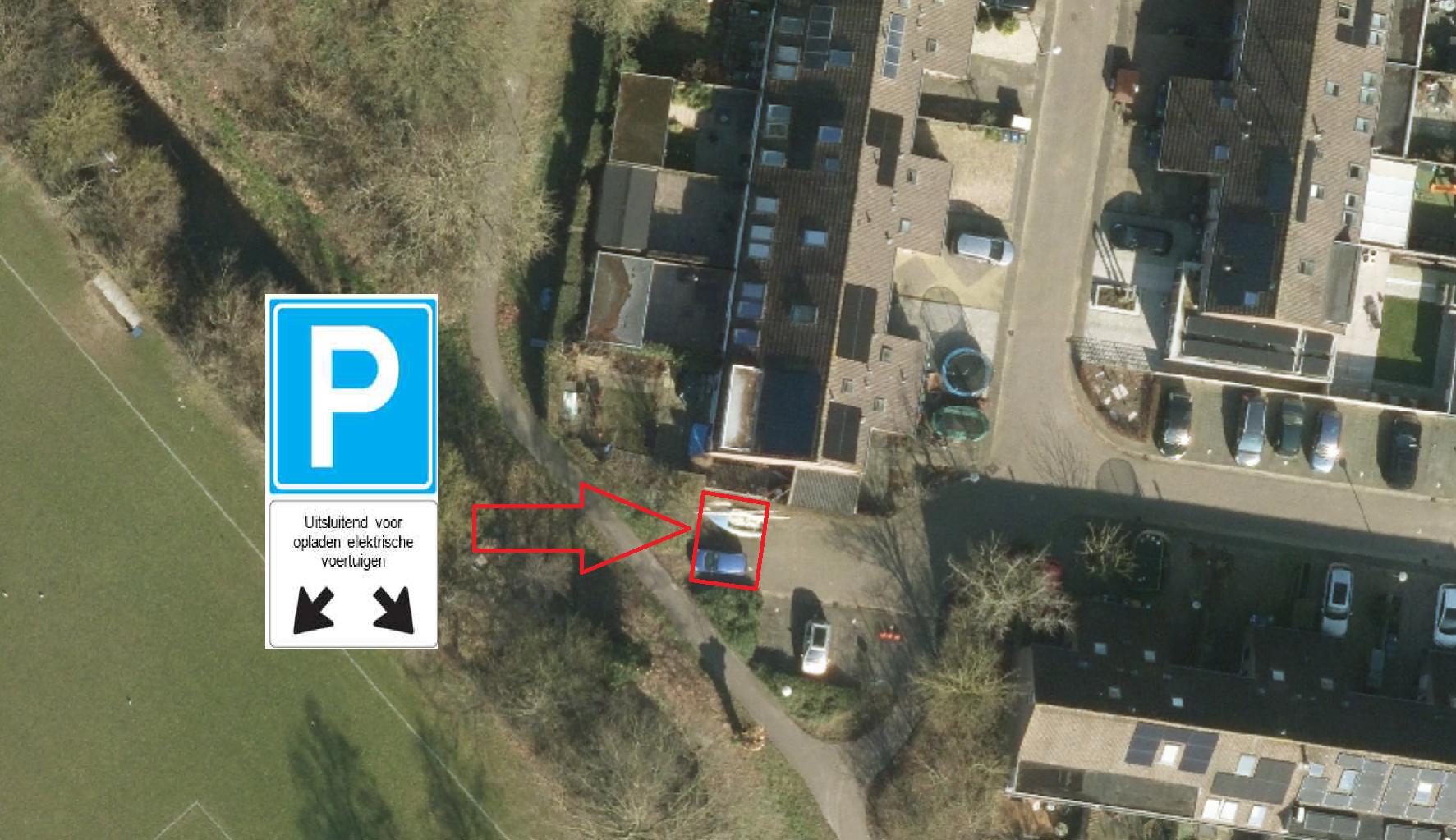 - door middel van het plaatsen van het verkeersbord E4 van bijlage 1 van het RVV 1990 met een onderbord met de tekst ‘opladen elektrische voertuigen’ – en een onderbord met pijlen, waaruit blijkt dat het bord voor twee parkeerplaatsen van toepassing is- op de Pinksterbloem ter hoogte van nummer 33, een tweetal parkeerplaatsen te reserveren op het aangrenzende parkeerterrein ten behoeve van het opladen van elektrische voertuigen.