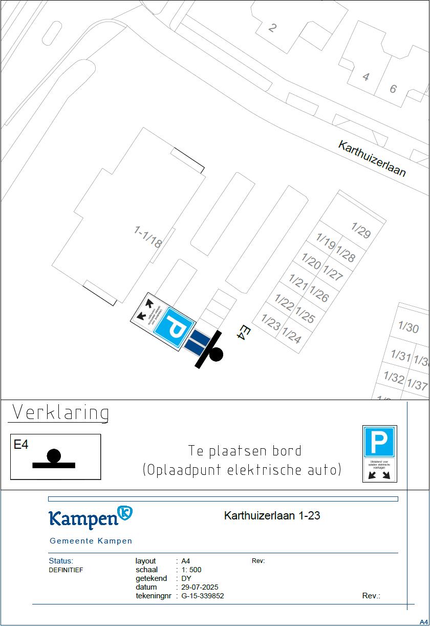 - door middel van het plaatsen van het verkeersbord E4 van bijlage 1 van het RVV 1990 met een onderbord met de tekst ‘opladen elektrische voertuigen’ – en een onderbord met pijlen, waaruit blijkt dat het bord voor twee parkeerplaatsen van toepassing is- op de Karthuizerlaan ter hoogte van nummer 1-23, een tweetal parkeerplaatsen te reserveren op het aangrenzende parkeerterrein ten behoeve van het opladen van elektrische voertuigen.