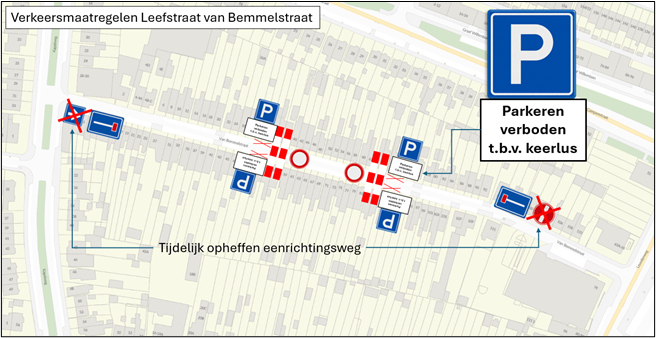 Om dit plan te realiseren wordt door middel van het plaatsen van verkeersborden C1 van bijlage 1 van het RVV 1990 een geslotenverklaring in beide richtingen voor voertuigen, ruiters en geleiders van rij- of trekdieren of vee op de van Bemmelstraat tussen de huisnummers 40 en 60 ingesteld, ondersteund met verplaatsbare hekwerken. Deze geslotenverklaring houdt in dat bestuurders dit deel van de van Bemmelstraat niet mogen inrijden of ingaan. Om de straat wel bereikbaar te houden voor bewoners wordt de eenrichtingsweg tijdelijk opgeheven door middel van het verwijderen van de verkeersborden C2 en C3 van bijlage 1 van het RVV 1990. Het opheffen van vier parkeergelegenheden wordt gedaan door middel van het plaatsen van verkeersbord E4 van bijlage 1 van het RVV 1990 met onderbord ‘parkeren verboden t.b.v. keerlus’.