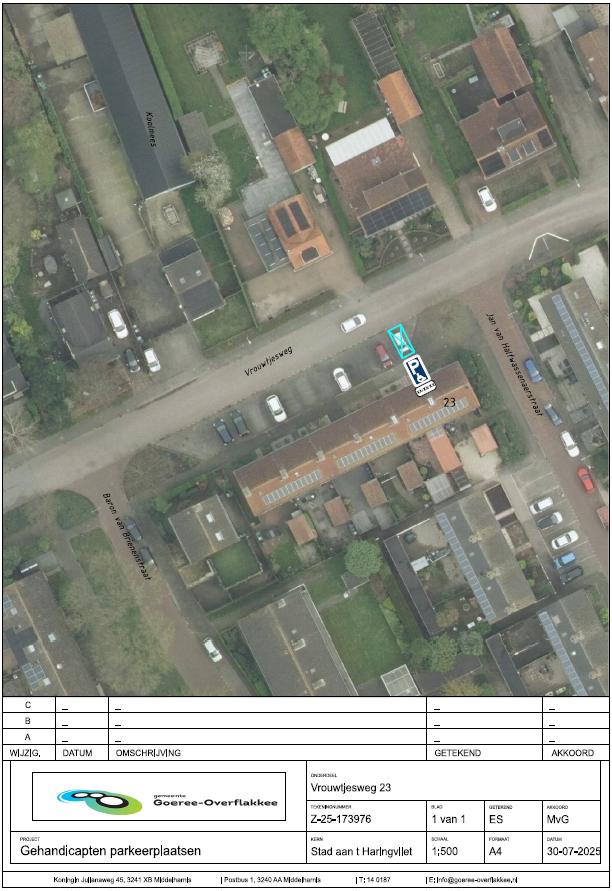 tot het aanwijzen van een gehandicaptenparkeerplaats op kenteken in de Vrouwtjesweg, in de haakse parkeervakken tegenover de woning met huisnummer 23 te Stad aan ‘t Haringvliet, door het plaatsen van verkeersbord E06 met onderbord OB309 met daarop het kenteken van de aanvrager conform model van bijlage I van het Reglement Verkeersregels en Verkeerstekens 1990;