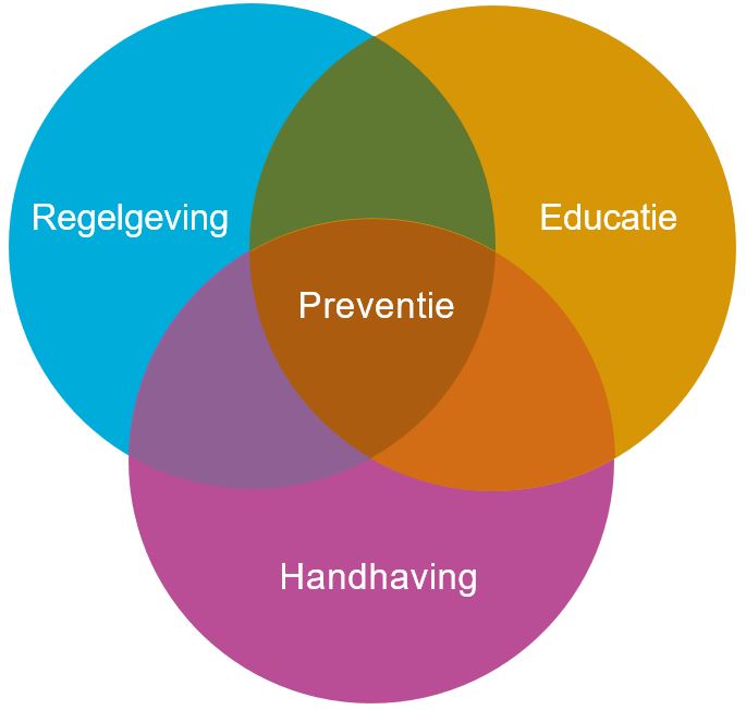 (1) educatie en voorlichting, (2) regelgeving en (3) toezicht en handhaving. Dit model laat zien dat een aanpak alleen effectief is wanneer er integraal wordt ingezet op alle drie pijlers. Binnen de pijler educatie en voorlichting kijken we specifiek naar de verschillende omgevingen.