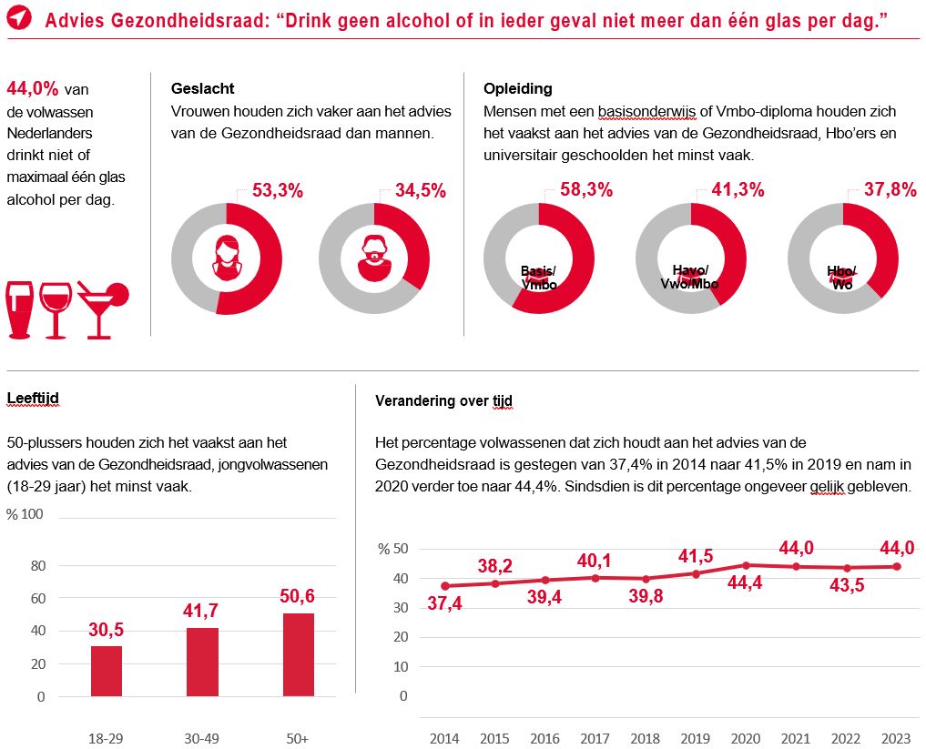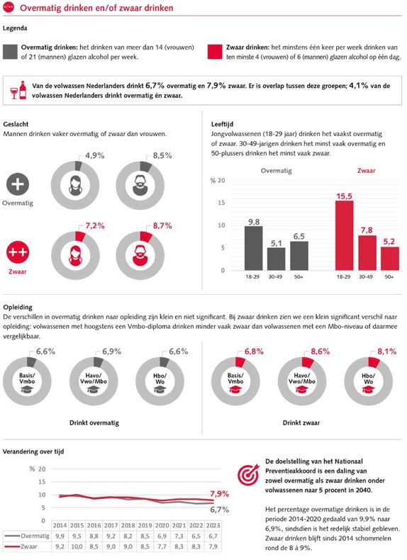 Recent heeft het Trimbos instituut de laatste cijfers over alcoholgebruik onder volwassenen van de Nederlandse bevolking gepubliceerd. De belangrijkste bevindingen over 2023 zijn; In 2023 dronken evenveel mensen als in 2022, alcoholgebruik is het hoogst onder mannen en jongvolwassenen, vergeleken met 2022 is het aantal mensen dat overmatig drinkt gedaald in 2023, het aantal mensen dat zwaar drinkt schommelt sinds 2014 tussen de 8 en 9%. 77,2% van de volwassenen drinkt weleens alcohol. Meer mannen(82,2%) dan vrouwen (72,5%) drinken weleens alcohol. De cijfers komen uit de landelijke Gezondheidsenquête15.