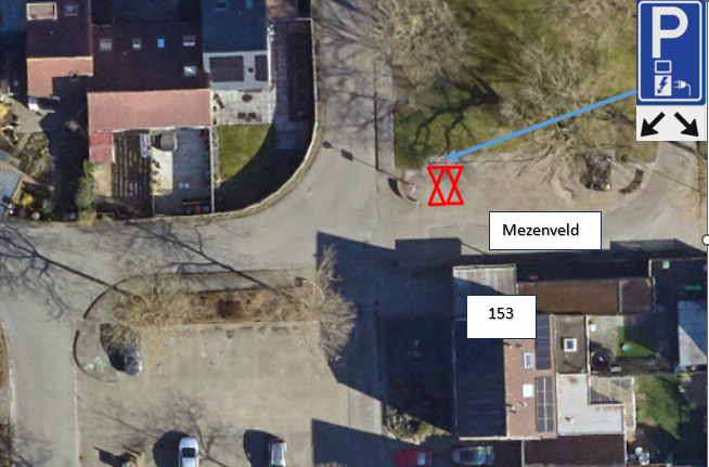 Door plaatsing van het verkeersbord model E8c met het onderbord OB504, reserveren we twee parkeervakken voor het opladen van elektrische voertuigen nabij de volgende adressen:
