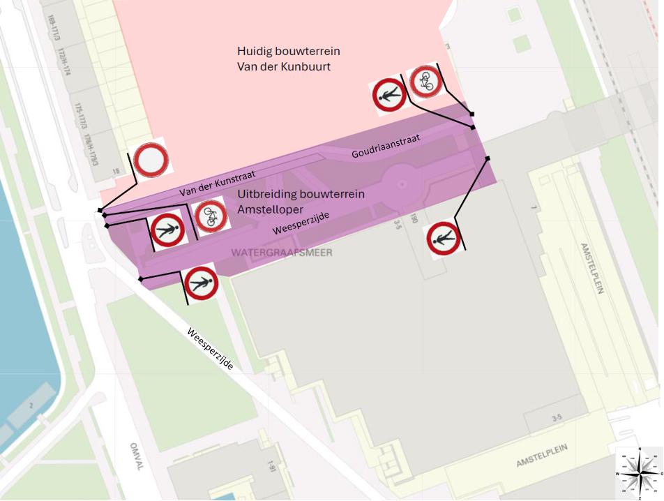 om ruimte te creëren voor het bouwverkeer, het bouwterrein en om de werkzaamheden veilig te kunnen uitvoeren de gemeente Amsterdam overgaat tot het instellen van de volgende tijdelijke verkeersmaatregelen op het deel van de van der Kunstraat en Goudriaanstraat tussen Weesperzijde en het Amstelplein en het deel van Weesperzijde tussen Weesperzijde en het Amstelplein: