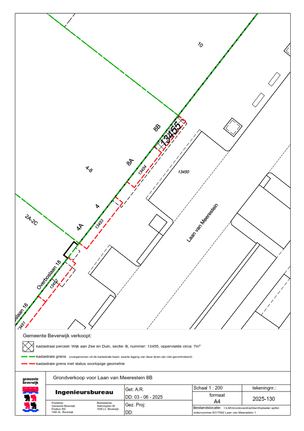 Gemeente Beverwijk (‘de gemeente’) geeft in dat kader te kennen dat zij voornemens om een perceel grond voor tuinuitbreiding (zoals aangegeven op bijgaande tekening), gelegen aan Laan van Meerestein 8B te Beverwijk, kadastraal bekend gemeente Wijk aan Zee en Duin, sectie B, nummer 13455, groot 7 m2, onderhands te verkopen. Naar het oordeel van de gemeente zijn de beoogde koper de enige serieuze gegadigde die in aanmerking komt voor de hiervoor vermelde verkoop.