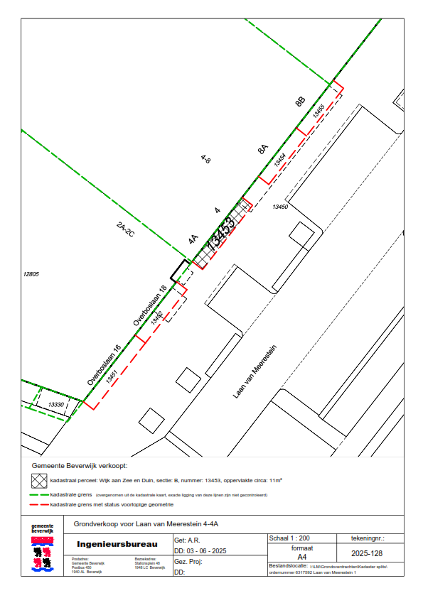 Gemeente Beverwijk (‘de gemeente’) geeft in dat kader te kennen dat zij voornemens om een perceel grond voor tuinuitbreiding (zoals aangegeven op bijgaande tekening), gelegen aan Laan van Meerestein 4 te Beverwijk, kadastraal bekend gemeente Wijk aan Zee en Duin, sectie B, nummer 13453, groot 11 m2, onderhands te verkopen. Naar het oordeel van de gemeente zijn de beoogde koper de enige serieuze gegadigde die in aanmerking komt voor de hiervoor vermelde verkoop.