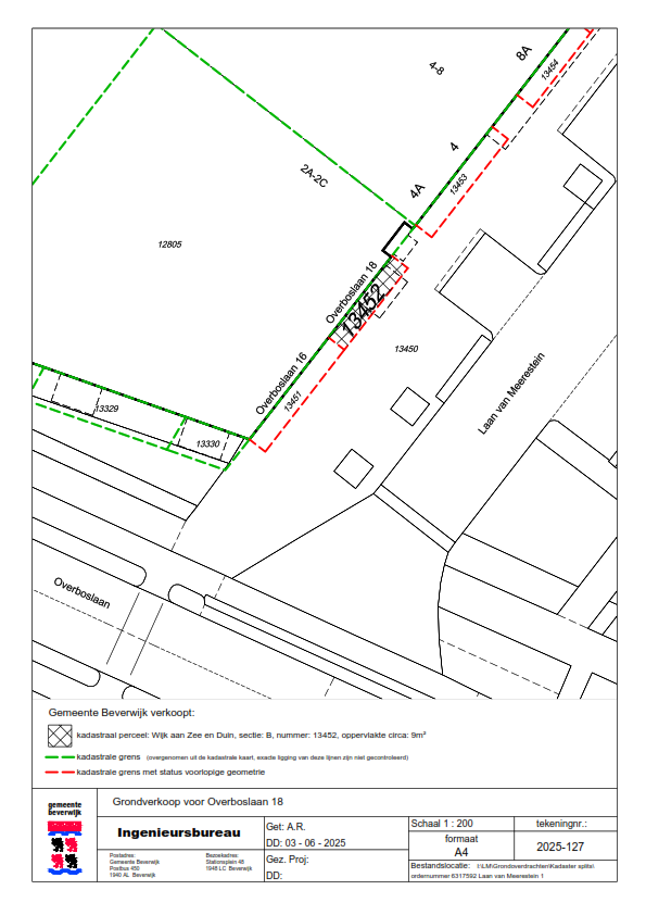 Gemeente Beverwijk (‘de gemeente’) geeft in dat kader te kennen dat zij voornemens om een perceel grond voor tuinuitbreiding (zoals aangegeven op bijgaande tekening), gelegen aan Overboslaan 18 te Beverwijk, kadastraal bekend gemeente Wijk aan Zee en Duin, sectie B, nummer 13452, groot 9 m2, onderhands te verkopen. Naar het oordeel van de gemeente zijn de beoogde koper de enige serieuze gegadigde die in aanmerking komt voor de hiervoor vermelde verkoop.