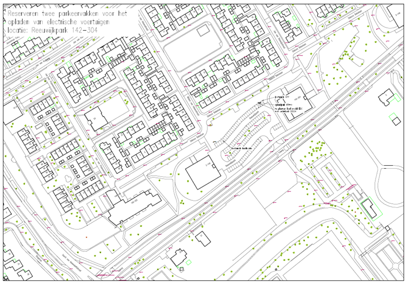 Ter voorbereiding op de bepaling van de locatie van de parkeerplaats voor het opladen van elektrische overtuigen heeft een inventarisatie op locatie plaatsgevonden. Naar aanleiding van het onderzoek, en in overleg met de omgeving, is voorgesteld om twee parkeerplaatsen te reserveren in de directe nabijheid van de Reeuwijkpark 142-304.
