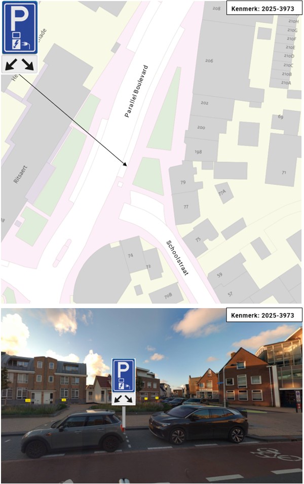 - dit bereikt kan worden door het plaatsen van verkeersbord E8c uit Bijlage 1 van het RVV 1990 met het onderbord OB504 (twee (2) pijlen ter aanduiding waar elektrische voertuigen opgeladen kunnen worden);