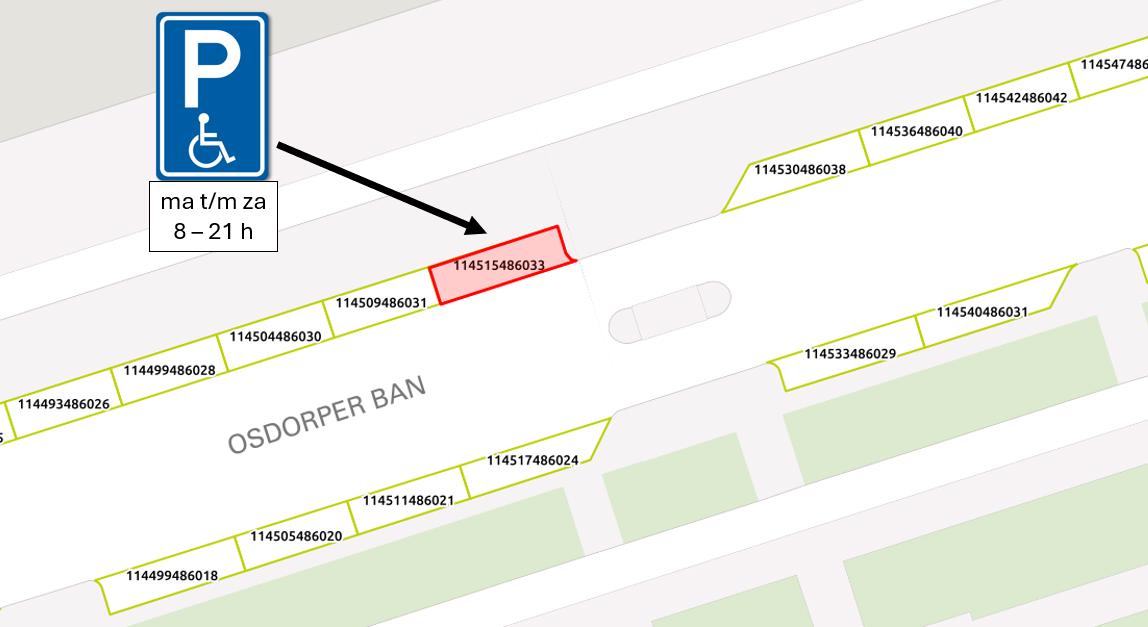 Door het plaatsen van verkeersbord conform model E6 van Bijlage I van het RVV 1990, voorzien van een onderbord met daarop de tekst ‘ma t/m za 8 – 21 h’, aan te wijzen: een algemene gehandicaptenparkeerplaats gedurende de venstertijden van maandag tot en met zaterdag tussen 8.00 en 21.00 uur, op de Osdorper Ban ter hoogte van perceelnummer 148, op parkeervaknummer 114515486033.