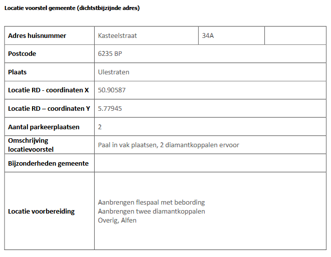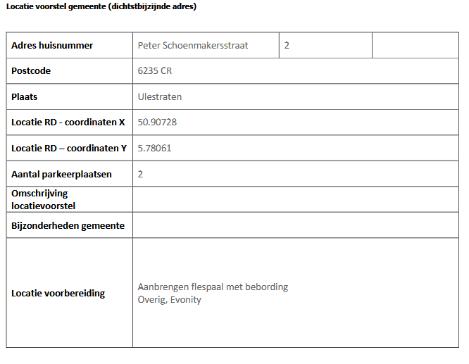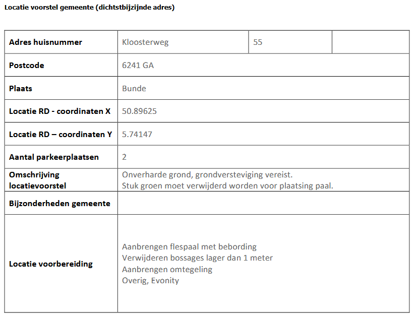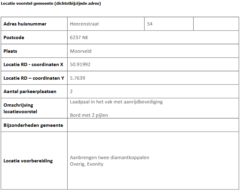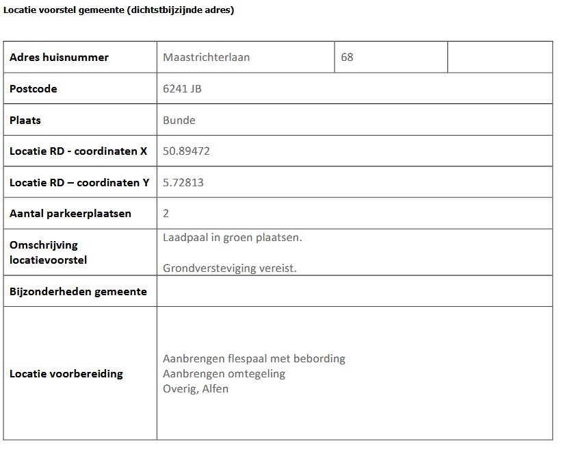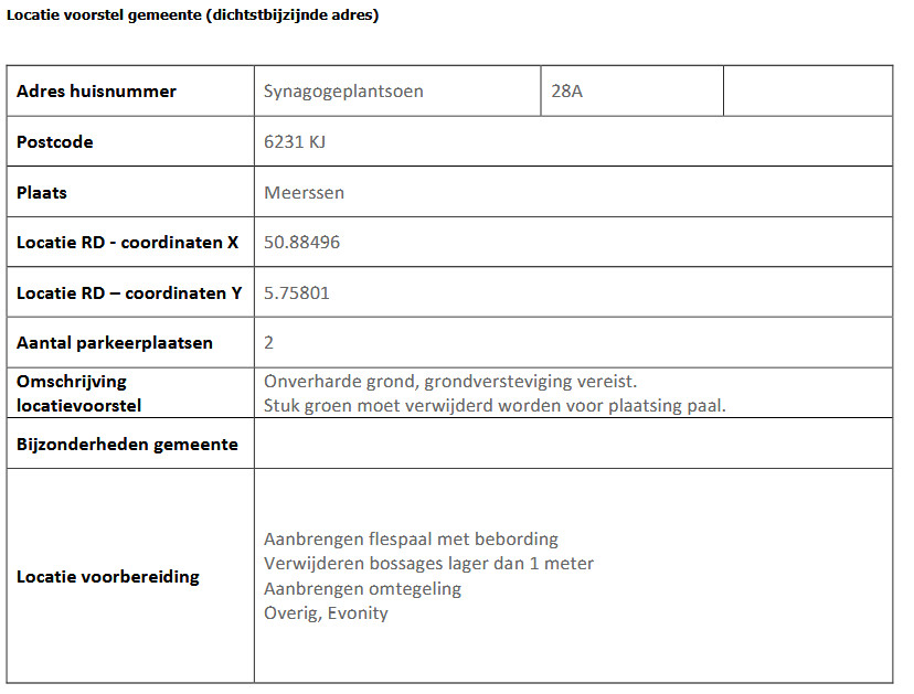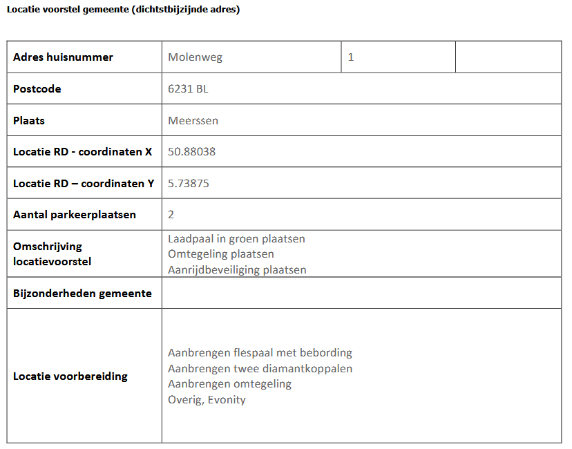 Het aanwijzen van twee parkeerplaatsen als parkeergelegenheid alleen bestemd voor het opladen van elektrische voertuigen, door plaatsing van de borden model E8c van het Reglement verkeersregels en verkeerstekens 1990 (RVV 1990) met, indien van toepassing, een onderbord model OB 504 (schuine pijl links en/of rechts), om de parkeerplaatsen aan te duiden, één en ander conform bijgevoegde situatietekening in Bijlage, op de volgende locaties in de gemeente Meerssen;