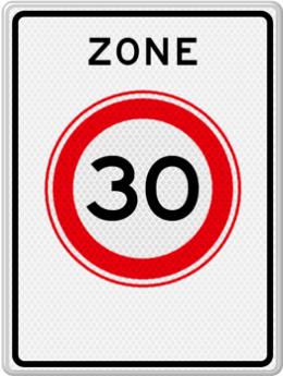 Vaststellen: Maximum snelheid 30 km per uur zone, begin en einde (borden A1 en A2 volgens bijlage 1 van het RVV 1990 met de aanduiding 30 en zone)