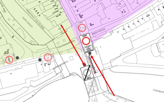 Tolsteegbrug (ter hoogte van en schuin tegenover huisnummer 1; wegvak in beide richtingen tussen het Ledig Erf en de Wijde Doelen)