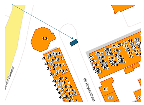 Het aanwijzen van een gehandicaptenparkeerplaats op kenteken tegenover de Ruyterstraat 2F1-2F7 door het plaatsen van een bord model E6 (RVV 1990 bijlage 1) voorzien van een onderbord met daarop het kenteken van het voertuig dat in gebruik is bij/ten behoeve van de aanvrager.
