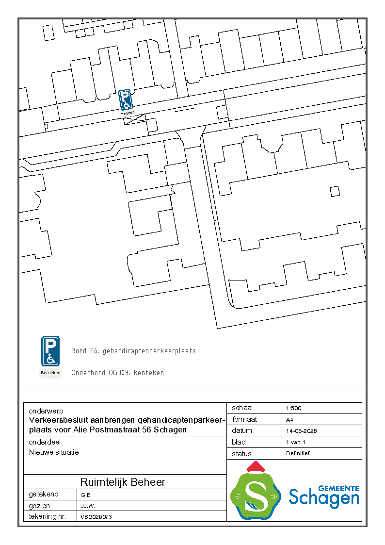 Gemeente Schagen- Verkeersbesluit gehandicaptenparkeerplaats op kenteken nabij Alie Postmastraat 56, Schagen.