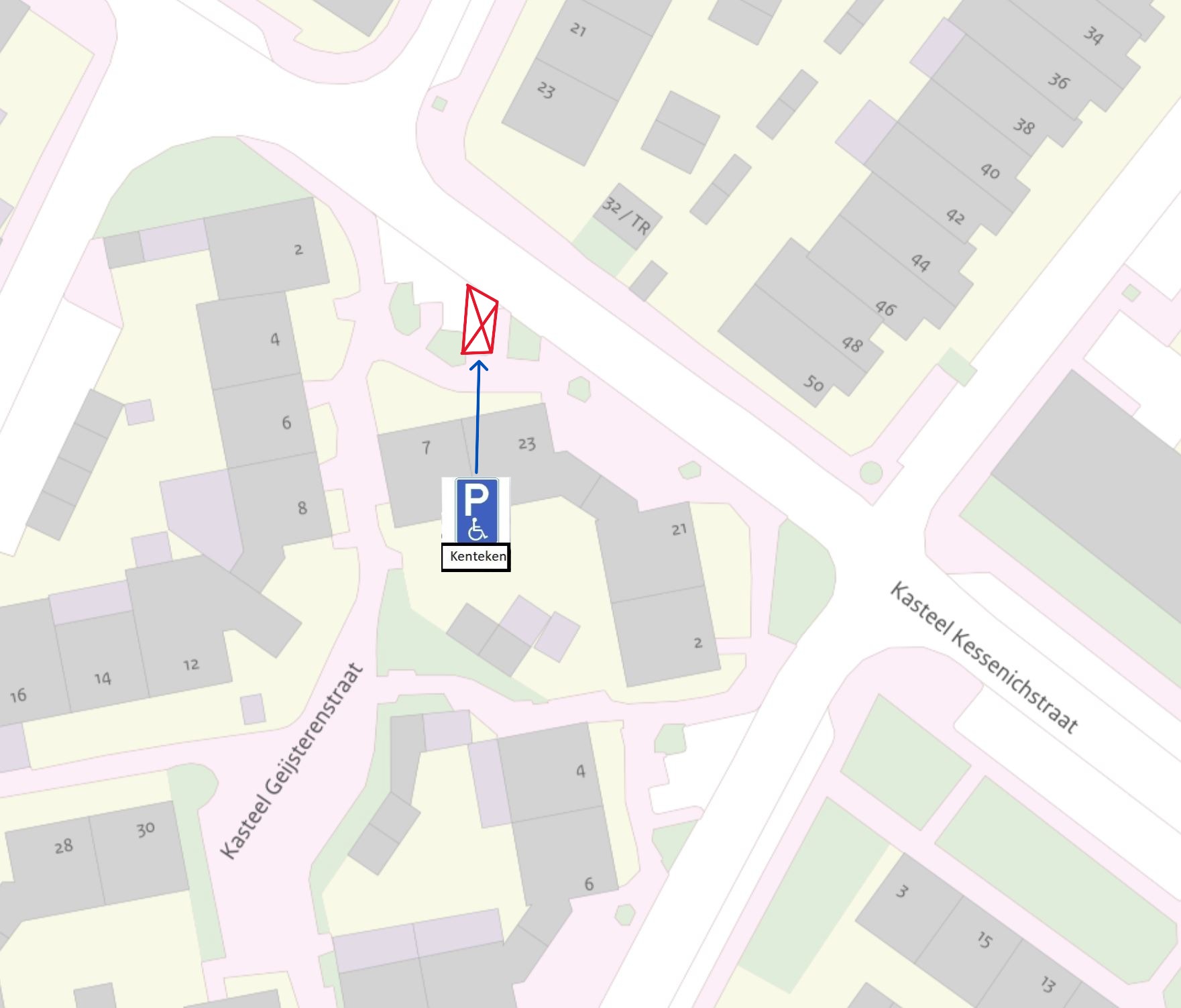 Er is een verzoek ingediend om een individuele gehandicaptenparkeerplaats te reserveren in de Kasteel Kessenichstraat, ter hoogte van Kasteel Geijsterenstraat 7. De aanvrager kan zich namelijk niet of slechts met grote moeite anders dan over een korte afstand te voet voortbewegen.