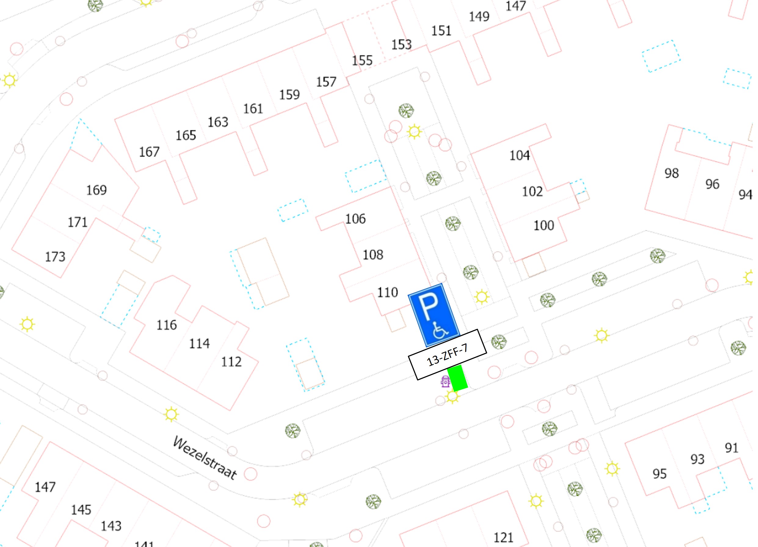 Het aanwijzen en inrichten van een gehandicaptenparkeerplaats op kenteken aan de Wezelstraat door het plaatsen van het verkeersbord E6 van het RVV 1990 met onderbord met kenteken 13-ZFF-7, zoals is aangegeven op de overzichtstekening in dit besluit.