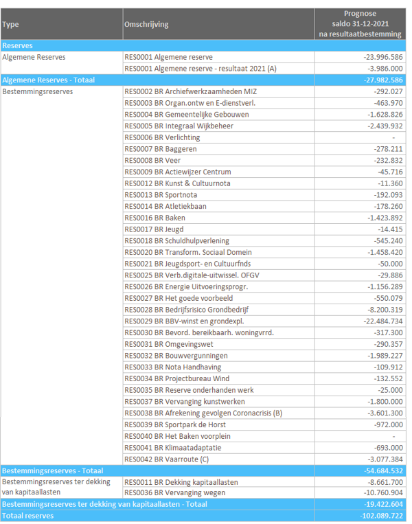 Voorgesteld wordt om de volgende reserves met ingang van 2022 op te heffen en de aanwezige saldi toe te voegen aan genoemde reserve: