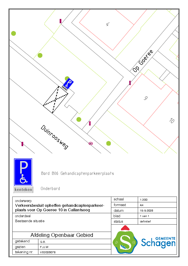 Gemeente Schagen- Verkeersbesluit opheffen gehandicaptenparkeerplaats nabij Op Goeree 11, Callantsoog.